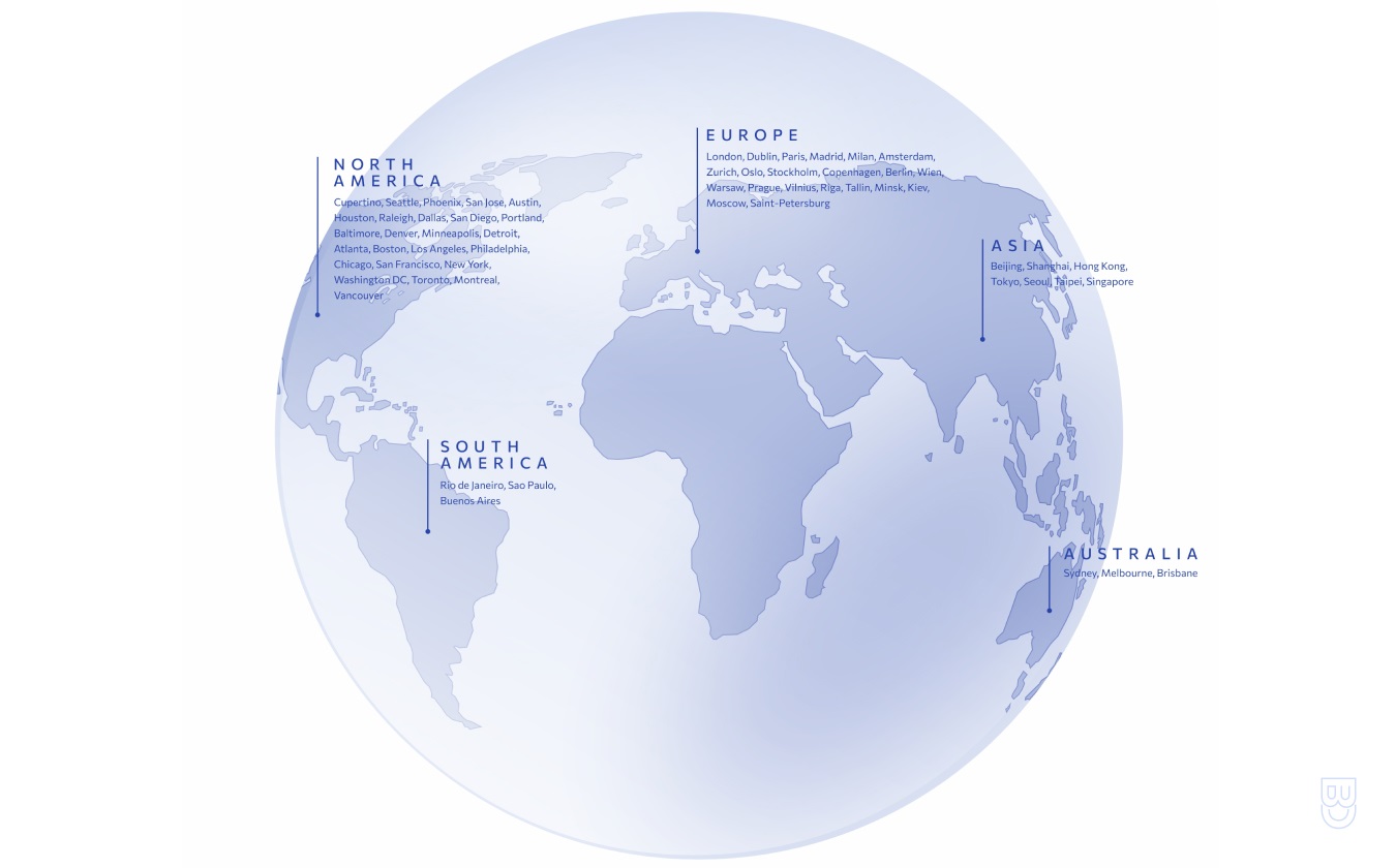 We work with all regions of the World: Europe - London, Dublin, Paris, Madrid, Milan, Amsterdam, Zurich, Oslo, Stockholm, Copenhagen, Berlin, Wien, Warsaw, Prague, Vilnius, Riga, Tallin, Minsk, Kiev, Moscow, Saint Petersburg North America - Cupertino, Seattle, Phoenix, San Jose, Austin, Houston, Raleigh, Dallas, San Diego, Portland, Baltimore, Denver, Minneapolis, Detroit, Atlanta, Boston, Los Angeles, Philadelphia, Chicago, San Francisco, New York, Washington DC, Toronto, Montreal, Vancouver Asia - Beijing, Shanghai, Hong Kong, Tokyo, Seoul, Taipei, Singapore